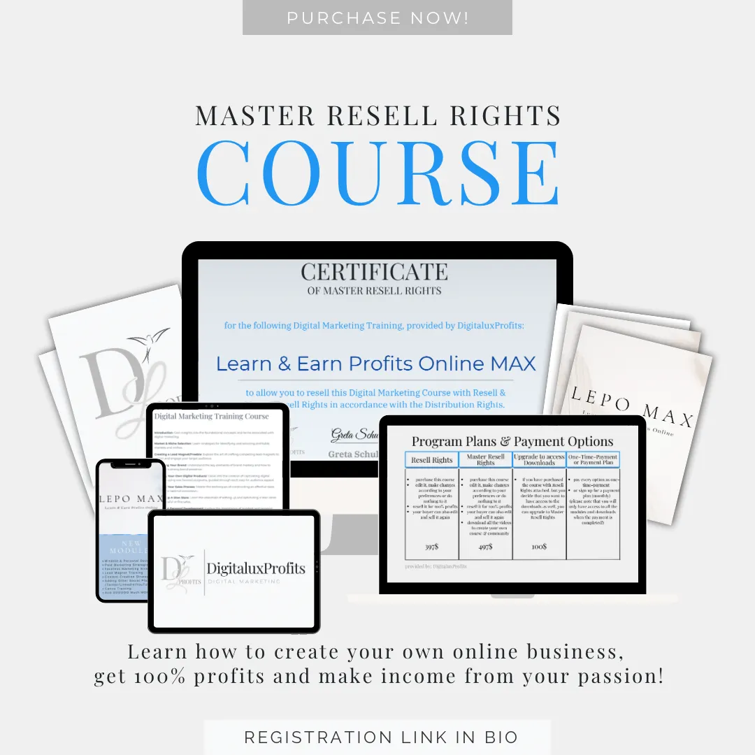 LEPO MAX with RESELL RIGHTS (RR) = purchase this course, learn ALL the essential skills, strategies & ways to set up your own business, gain invaluable knowledge about digital marketing, get access to a lovely and passionate community, and resell the course for 100% profits!